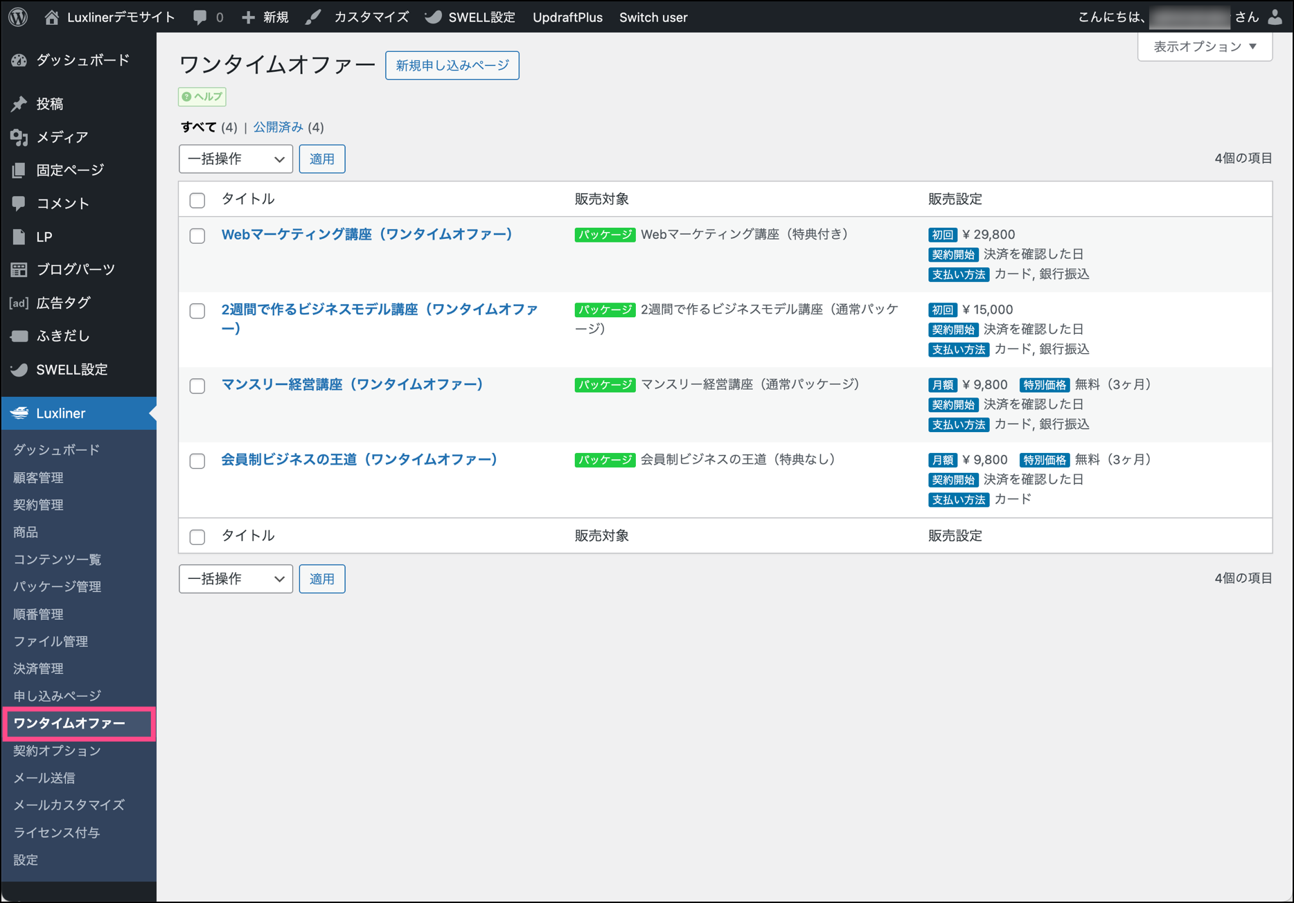 Luxlinerのメニューからワンタイムオファーをクリックすると、ワンタイムオファー一覧画面が表示されます。