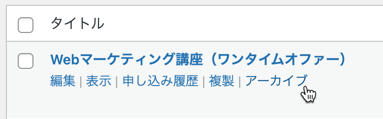 タイトルの下に表示されるアーカイブリンクをクリックすると、このワンタイムオファーをアーカイブします。不要となった申し込みページをアーカイブすることで、通常の申し込みページ一覧から除外することができます。