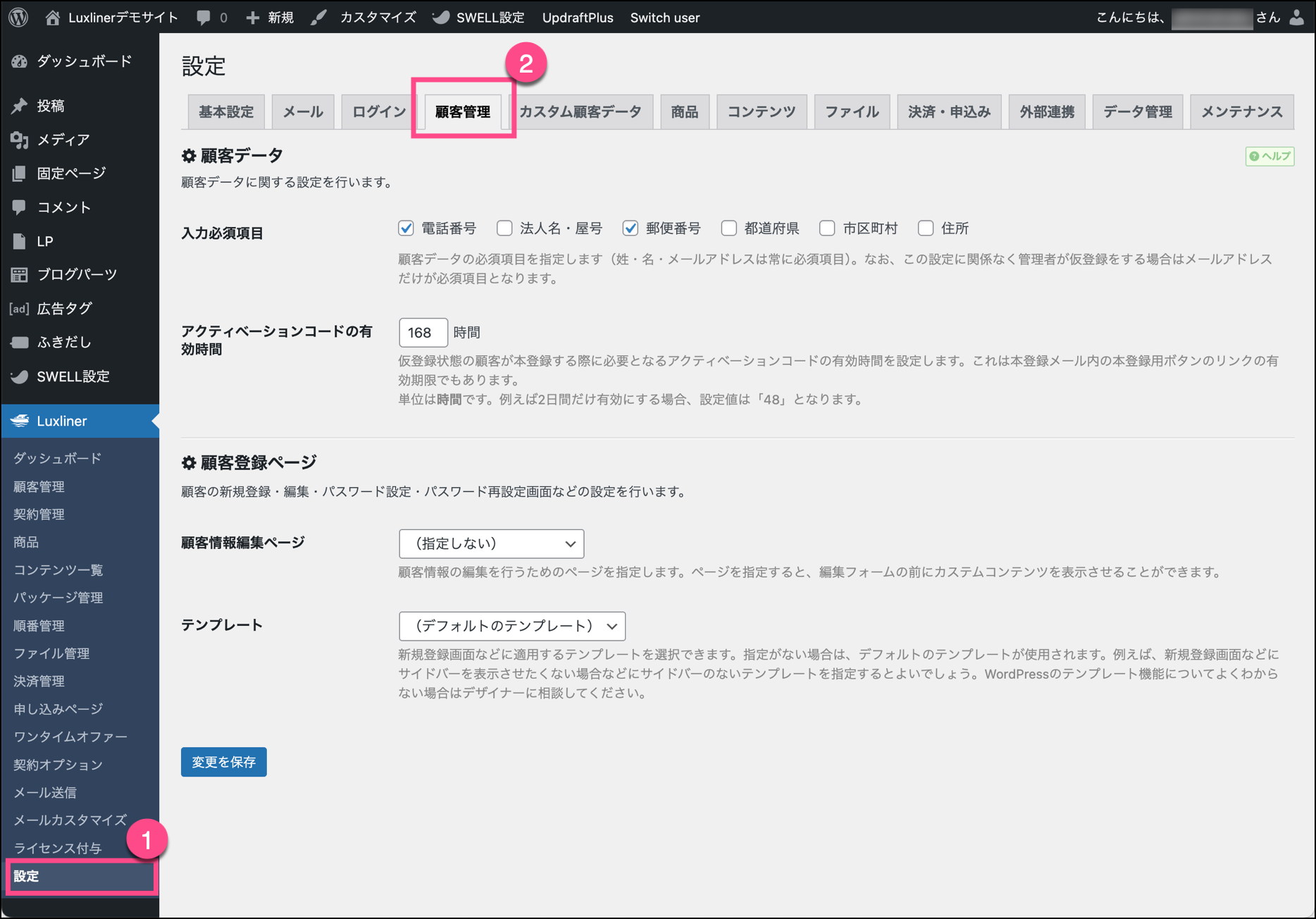 Luxlinerの顧客管理設定画面は、以下の手順で表示します。
