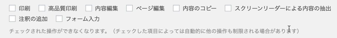 保護したい各項目をチェックすることで、ダウンロードされたPDFファイルに対する保護をかけます。