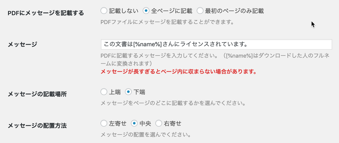 挿入するメッセージを指定します。[%name%]の部分はファイルをダウンロードした顧客(会員)のフルネームが挿入されます。