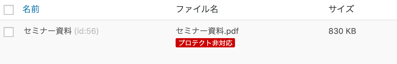 Luxlinerの保護機能が対応していないPDFファイルは、ファイル管理画面で以下のように「プロテクト非対応」と表示されます。