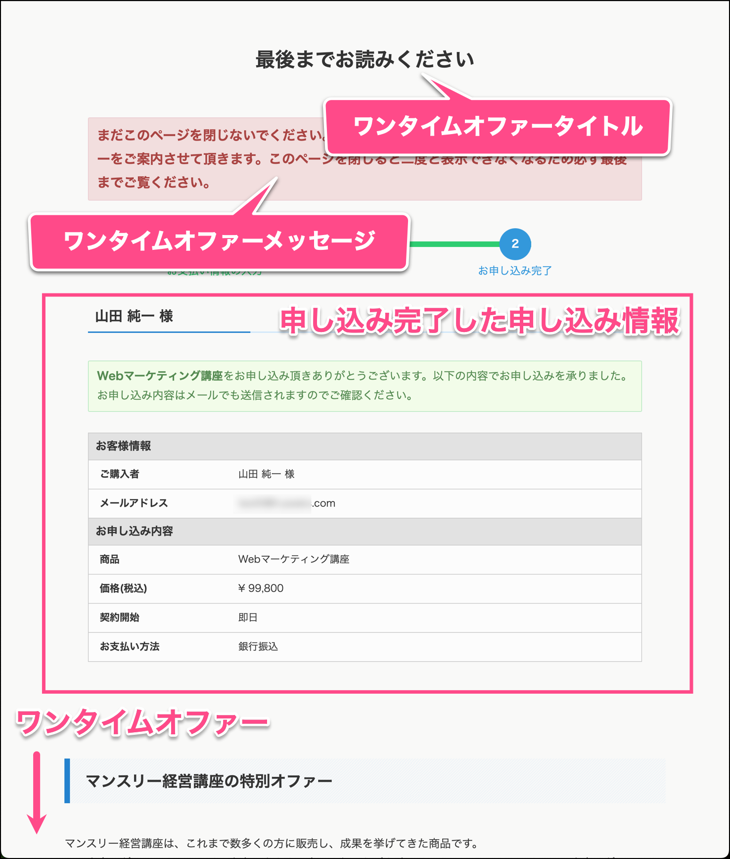 申し込みページにワンタイムオファーが設定されている場合は、申込み完了後に以下の画像のようにワンタイムオファーを提示します。ワンタイムオファーについてはこちらをご覧ください。