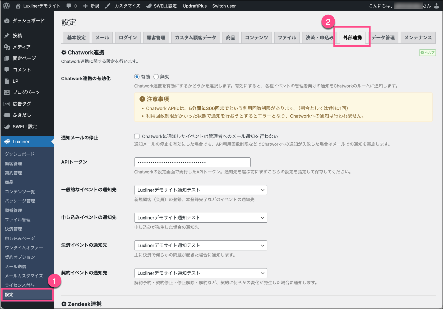 LuxlinerのChatwork連携を有効にすると、通常は管理者にメールで通知される各種イベントをChatworkで受け取れるようになります。