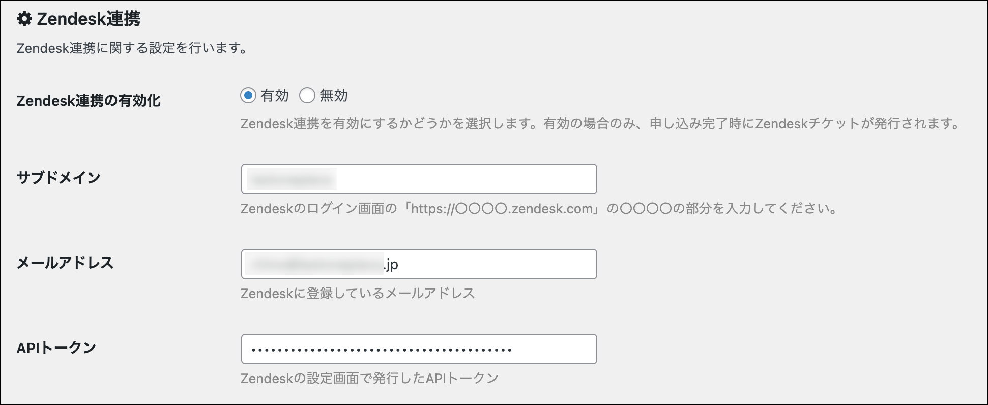 Zendesk連携を有効にするかどうかを選択します。有効の場合のみ、申し込み完了時にZendeskチケットが作成します。
