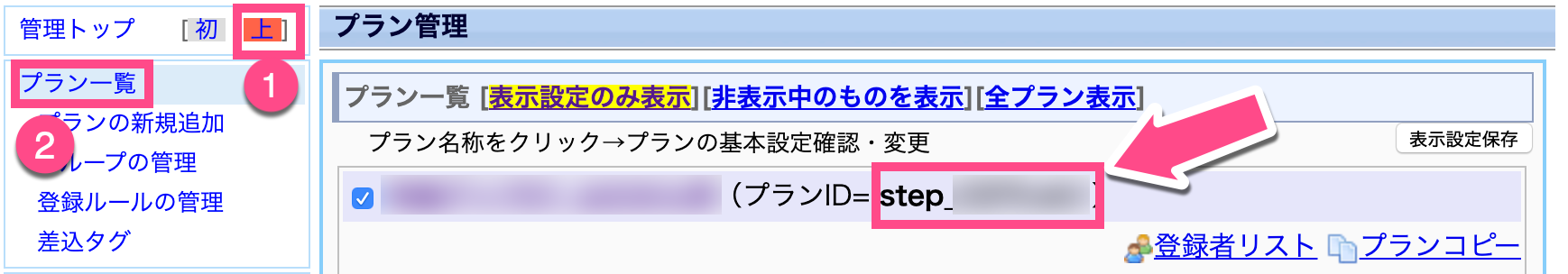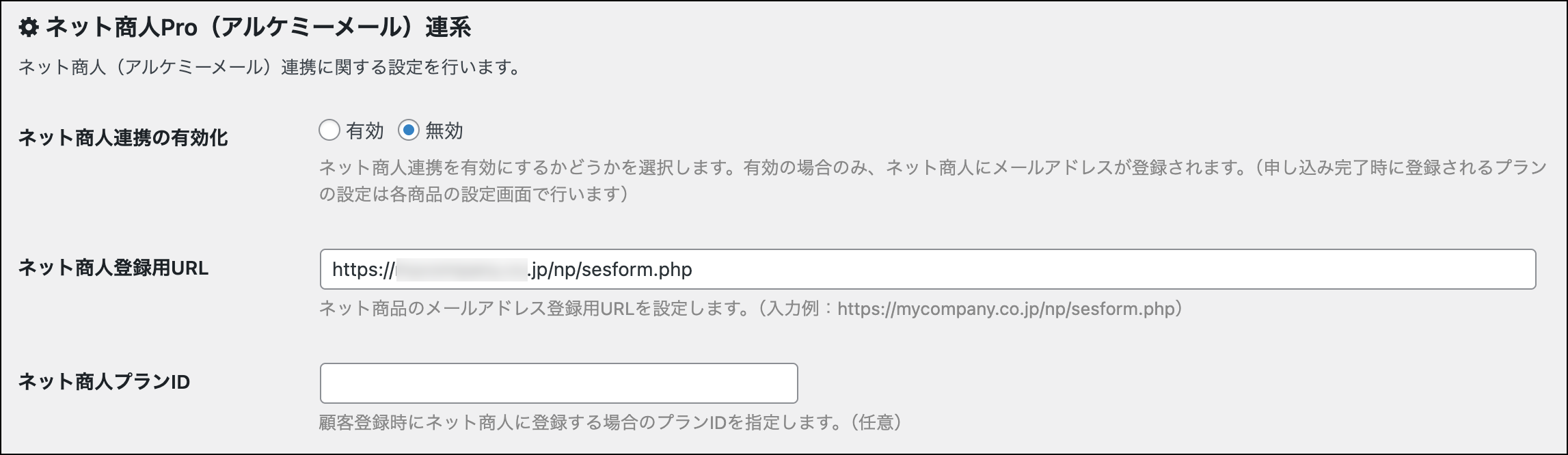 プランIDは、Luxlinerではなくネット商人(アルケミーメール)の設定ページ(下図参照)で指定された値を入力します。
