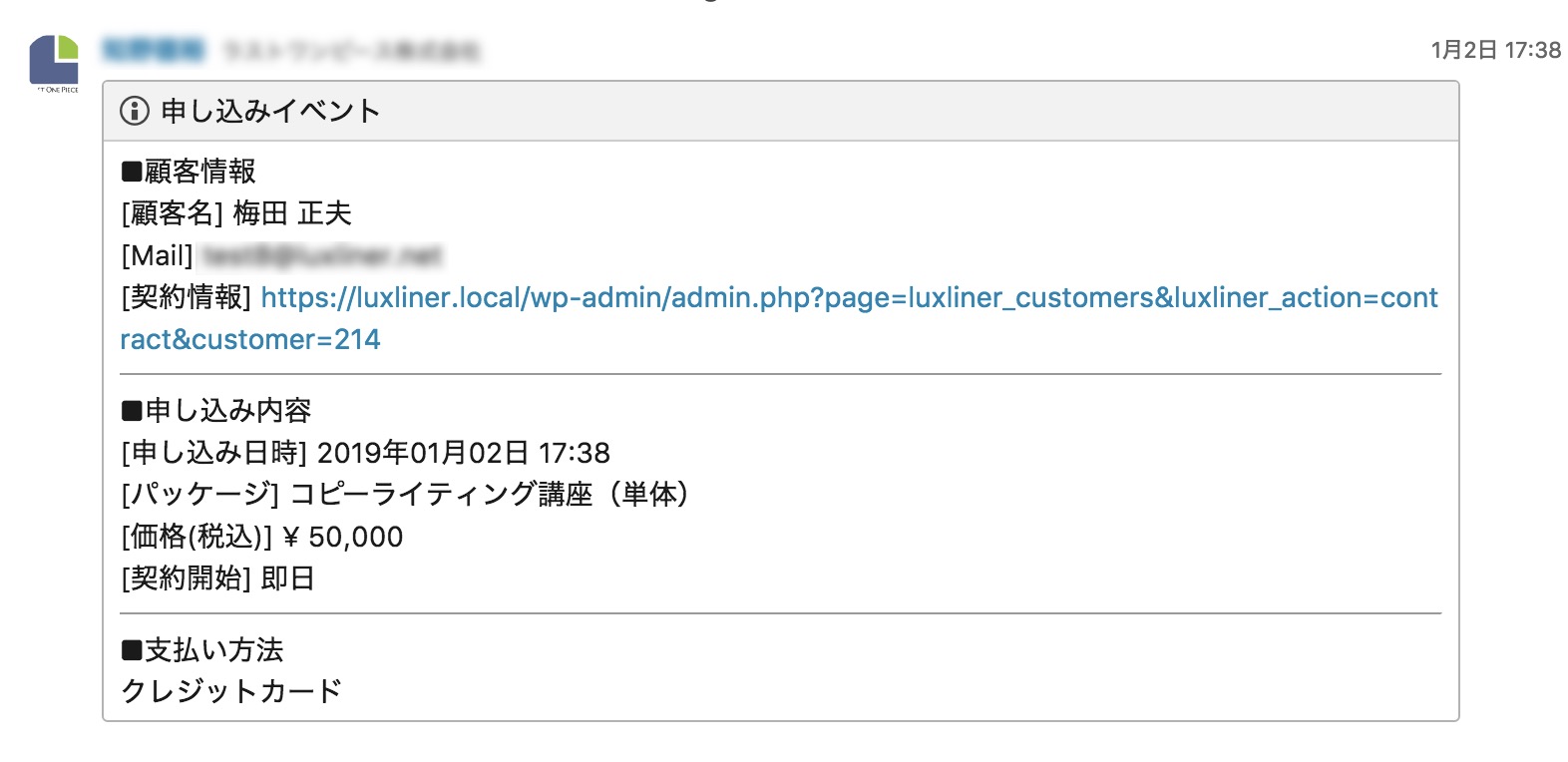 申し込みがあった時の通知例