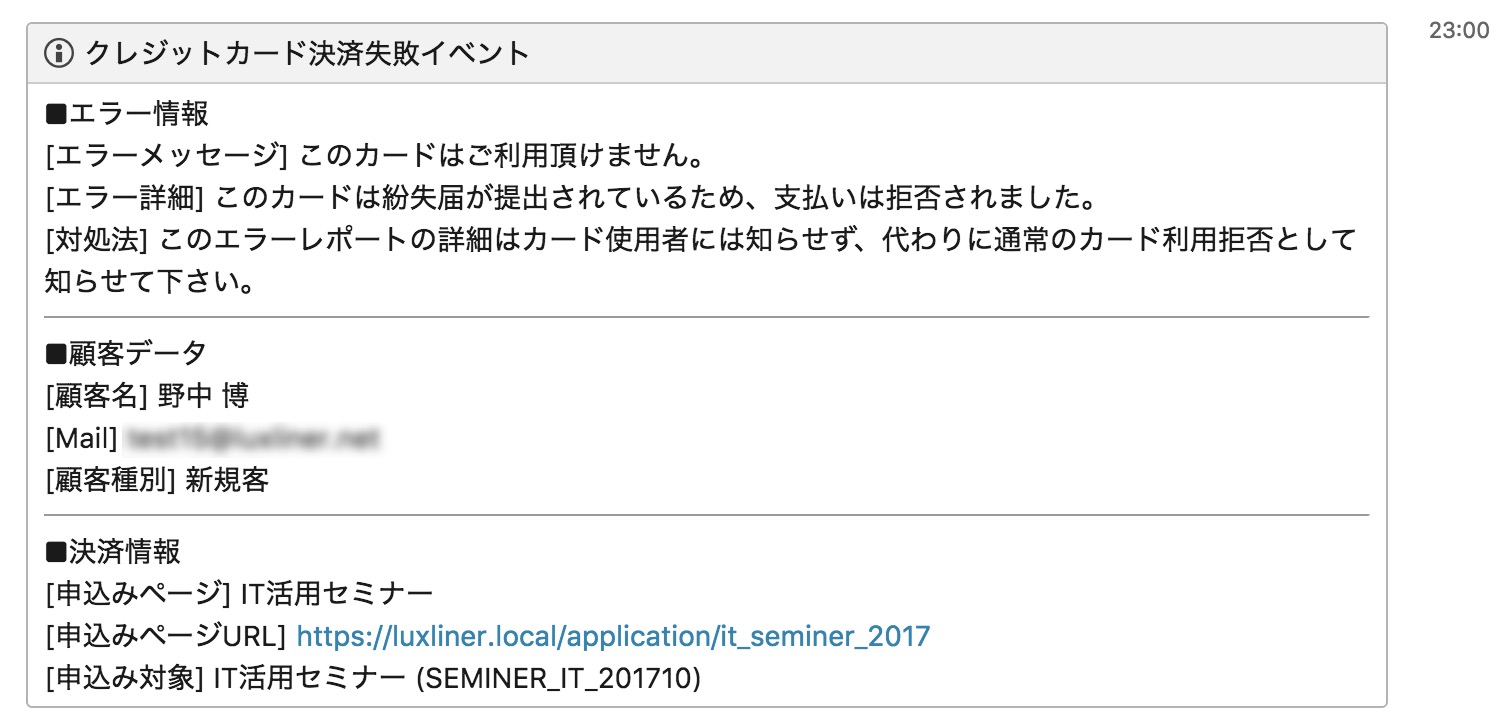 申し込みページでカード決済が失敗した時の通知例