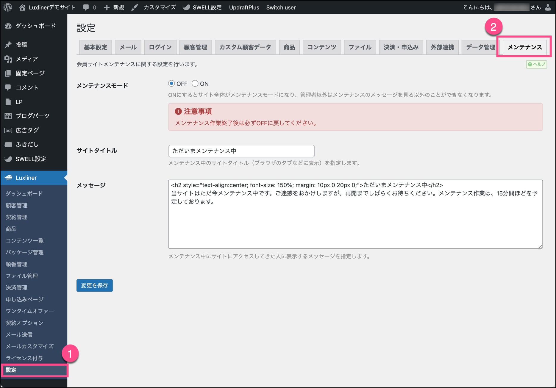 メンテナンスモードを「ON」にするとサイト全体がメンテナンスモードになり、管理者以外はいかなる操作もできなくなり、メンテナンスのメッセージが表示されるだけとなります。