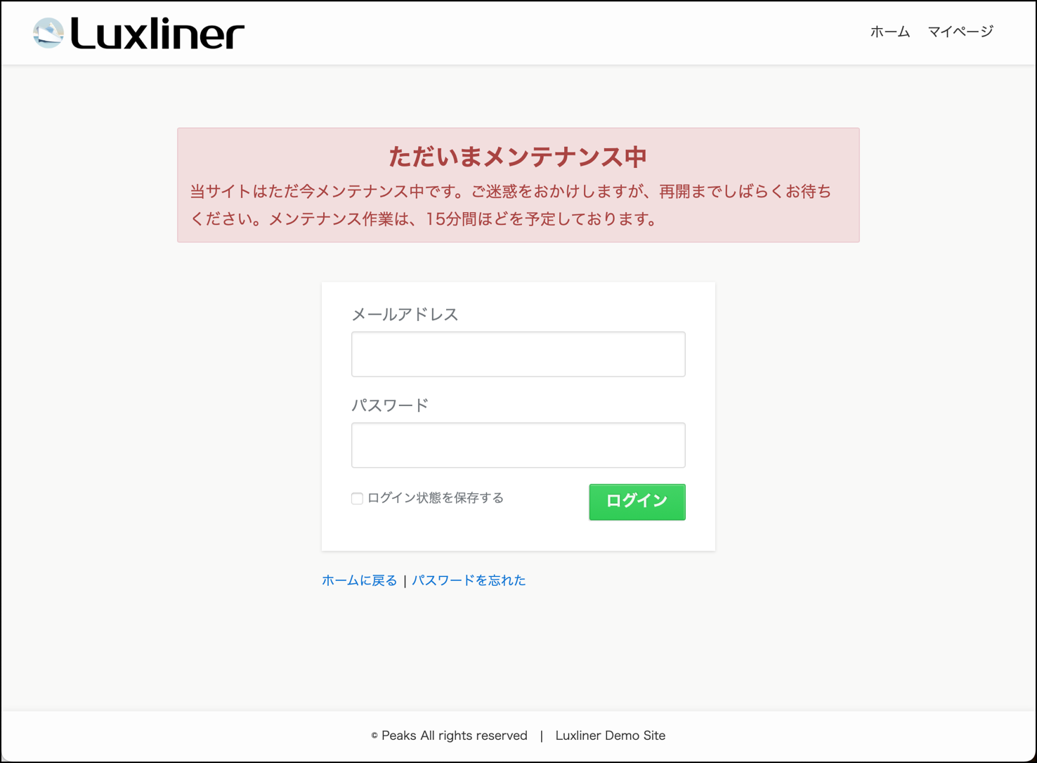 メンテナンスモード中でも、ログイン画面は表示されます。カスタムログインを有効にしている場合は、ログインフォームの上部にもメンテナンスメッセージが表示されます。