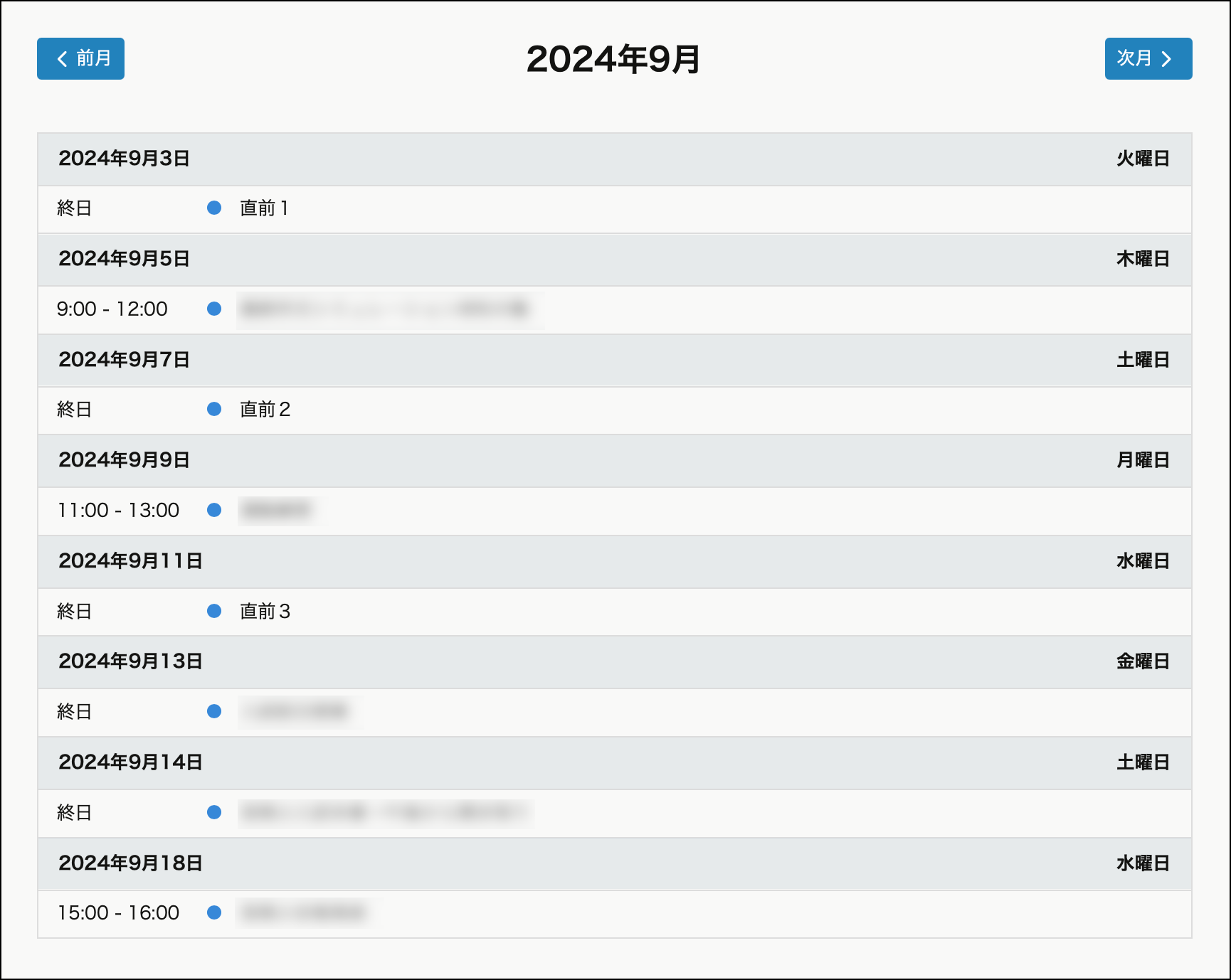 よくあるGoogleカレンダーの貼り付けコードとは異なり、API経由でデータを取得しており、デザインが最適化されています。グリッド形式とリスト形式の2つの表示形式を選べます。