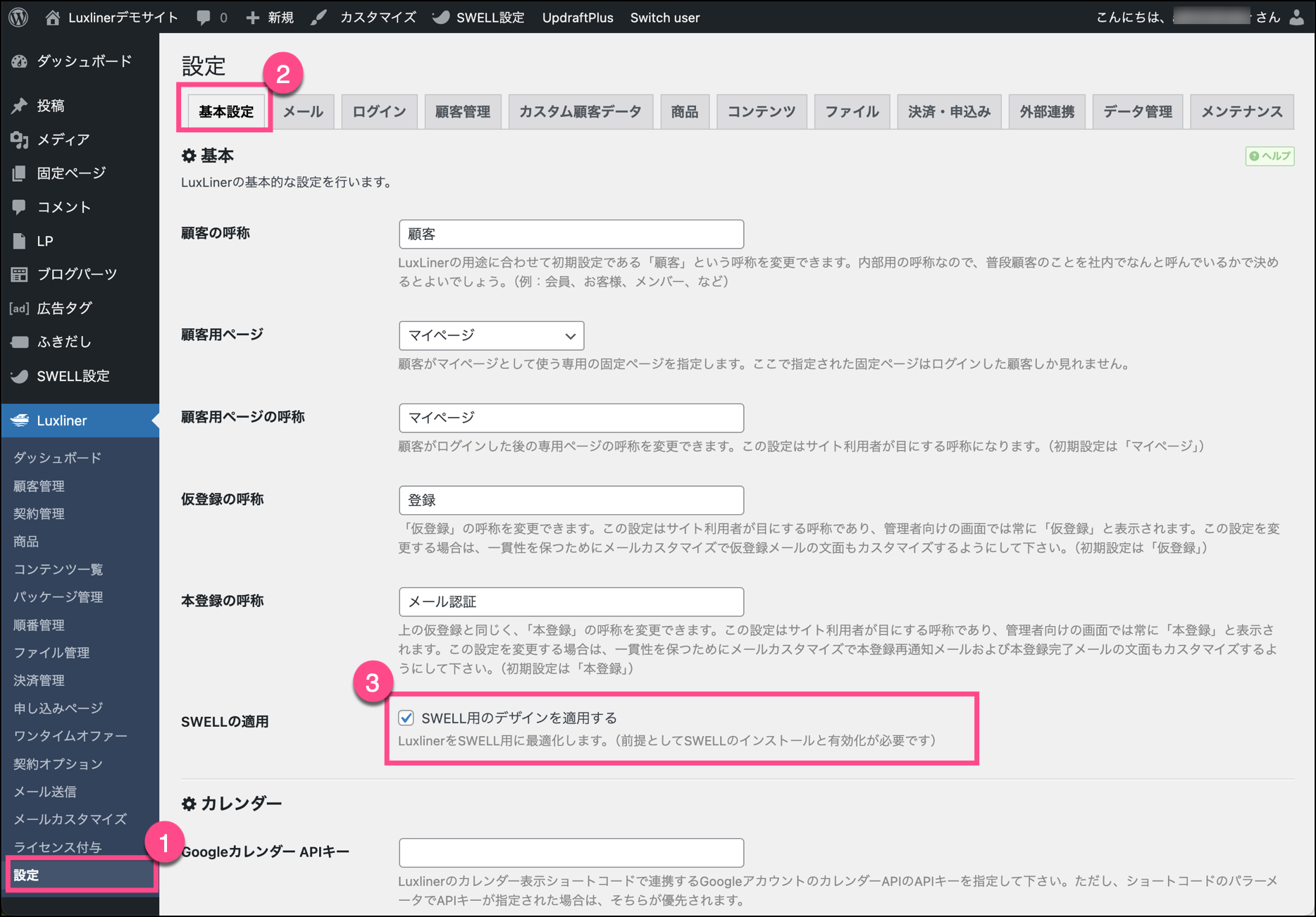 SWELLをインストールして有効化しただけでも、SWELLのデザインは適用されますが、LuxlinerをSWELLに最適化させるためには、以下のようにLuxliner内の設定を変更する必要があります。