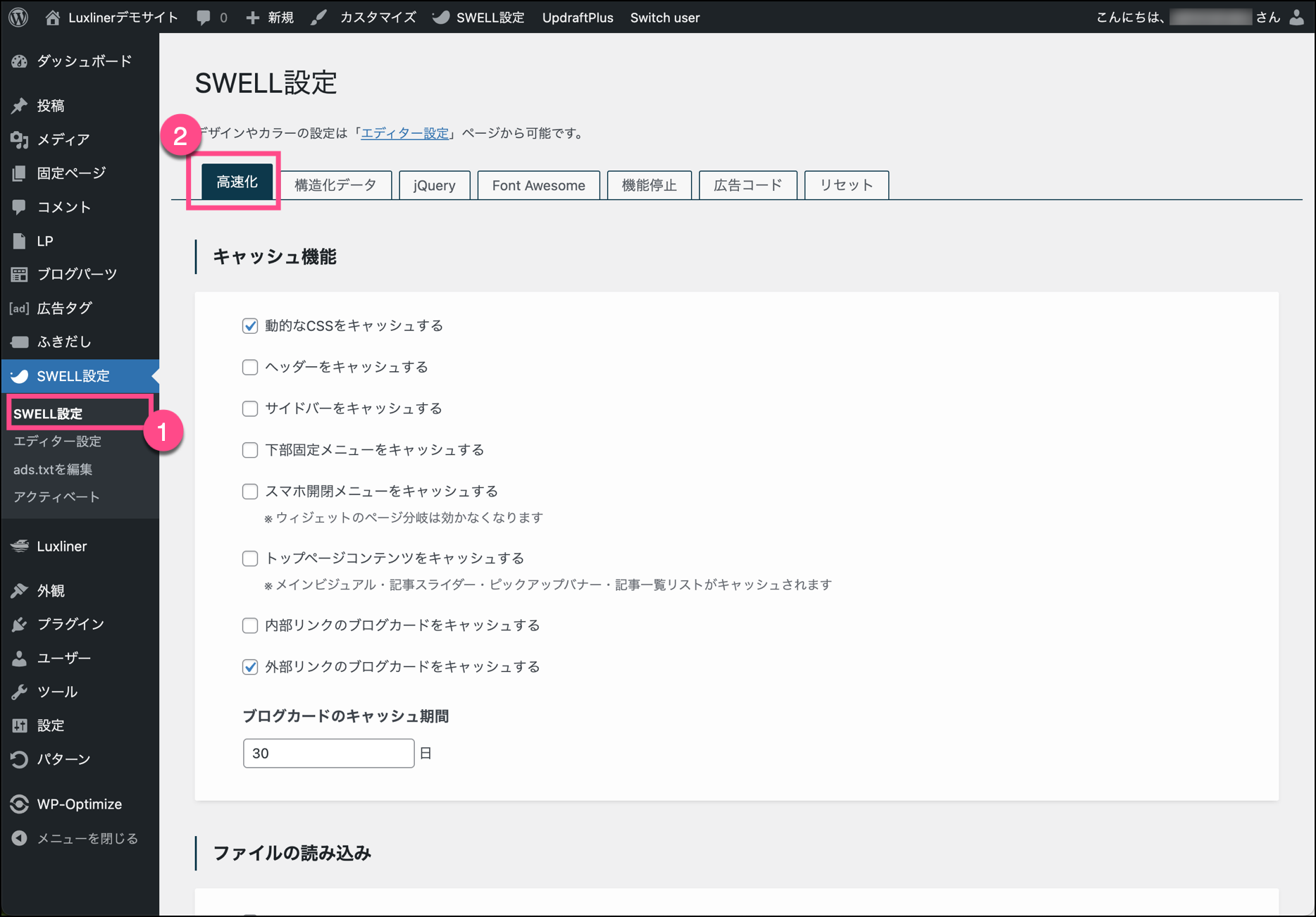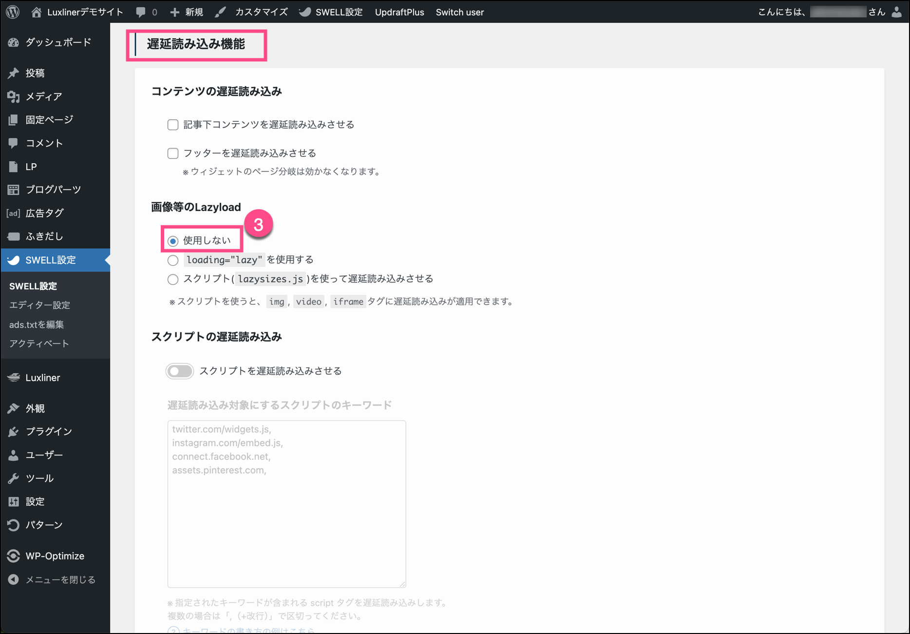 下のほうにある画像等のLazyloadを「使用しない」に設定します。