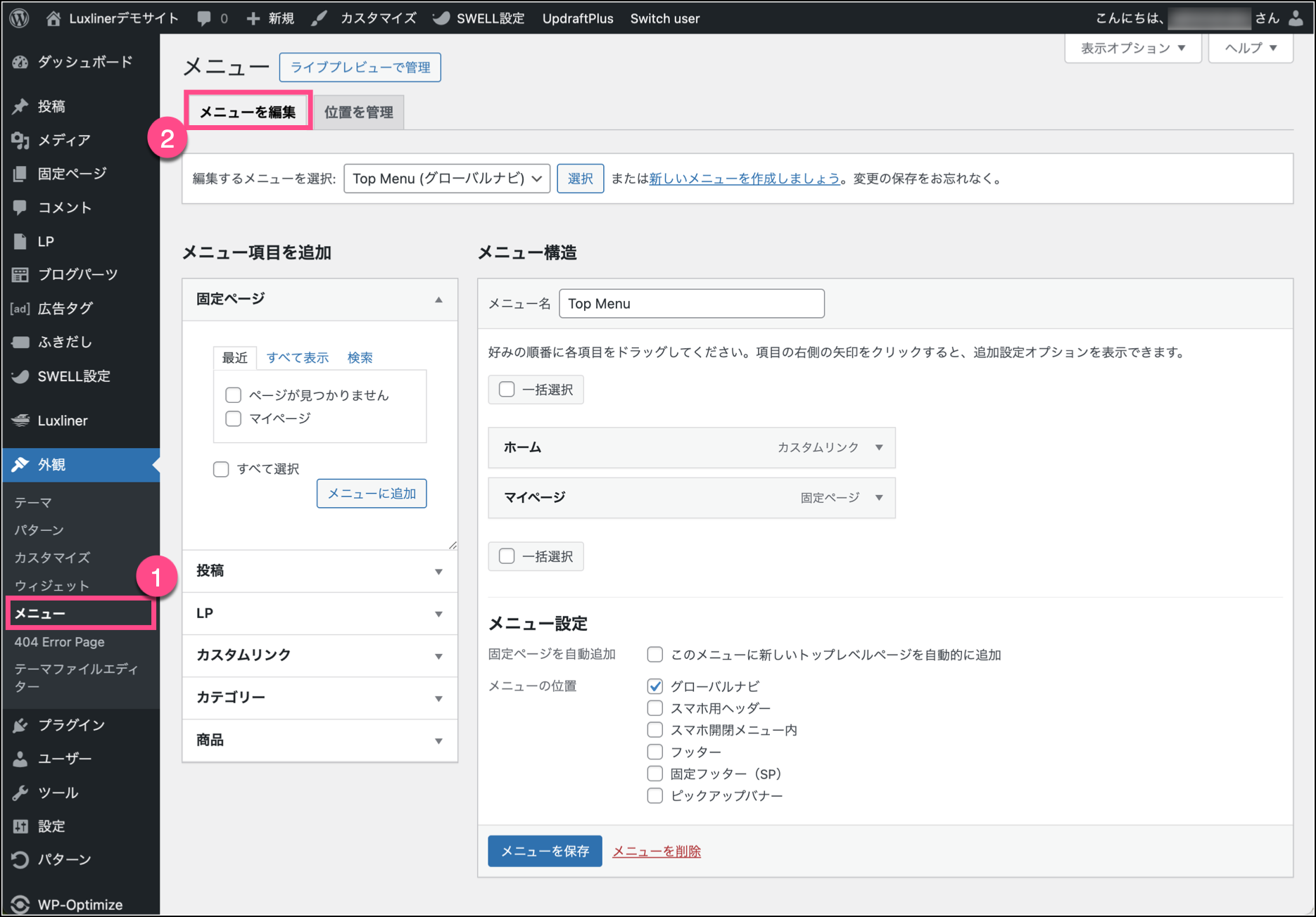 6. メニューのカスタマイズ 2024 9/27 SWELL導入マニュアル 目次設定の変更 現在のサイト全体のメニューの表示状況を確認し、必要に応じて表示位置などの設定を変更してください。 メニューの設定内容はサイトごとに異なるため上の画像は一例ですが、メインとなるメニューは通常グローバルナビにチェックを入れます。 最後に必ず メニューを保存 ボタンを押して設定を保存して下さい。 SWELL導入マニュアル 5. Font Awesome 7. サイドメニューのアイコン