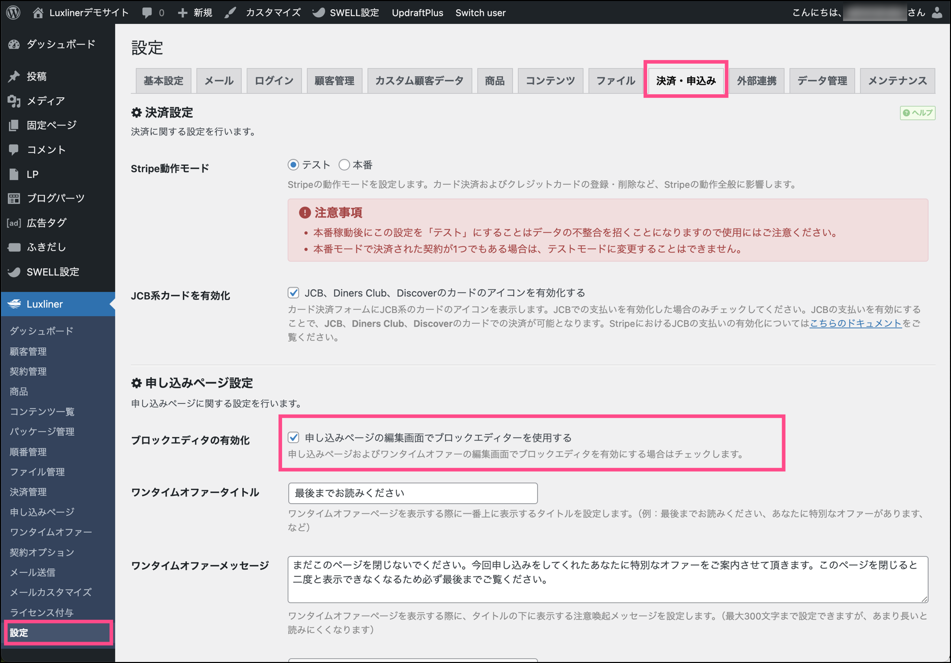 申し込みページ編集時のブロックエディタの有効化