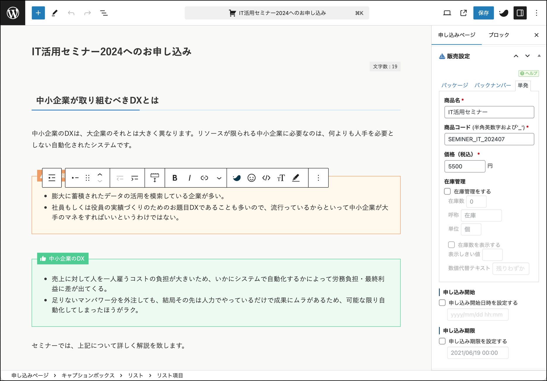 以下はブロックエディタが有効化された申し込みページの編集画面です。右側の販売設定などの項目はこれまで通りです。