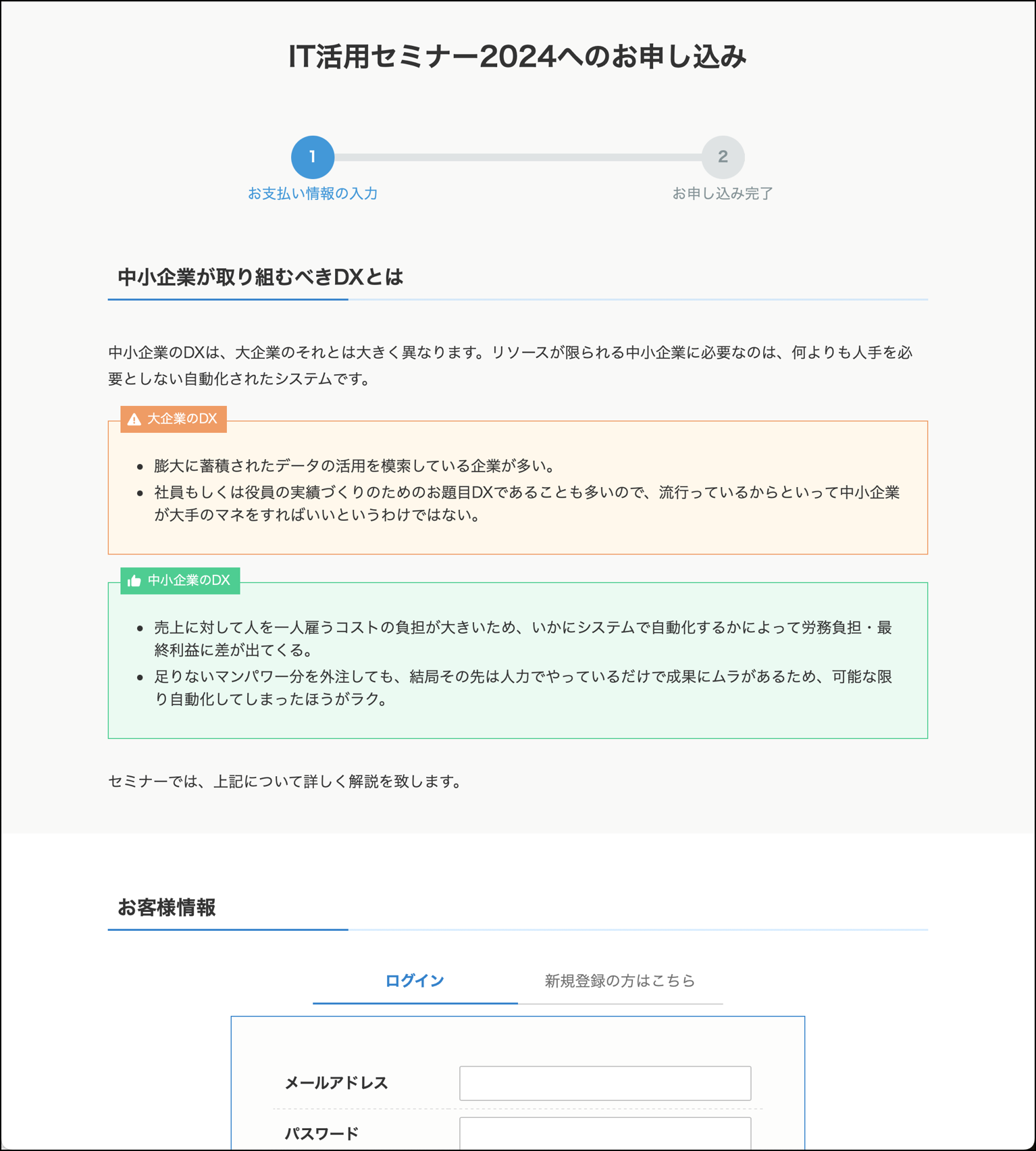 以下の例では、申込フォームの手前にセミナーの内容について簡単な説明を記載しています。