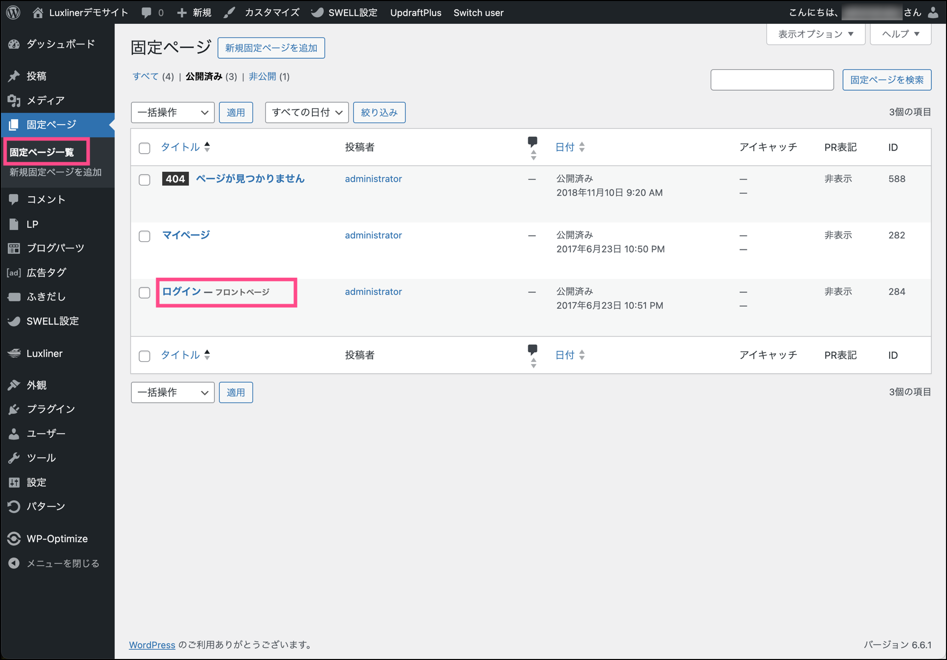 固定ページの一覧からログインのタイトルをクリックして編集画面に入ります。