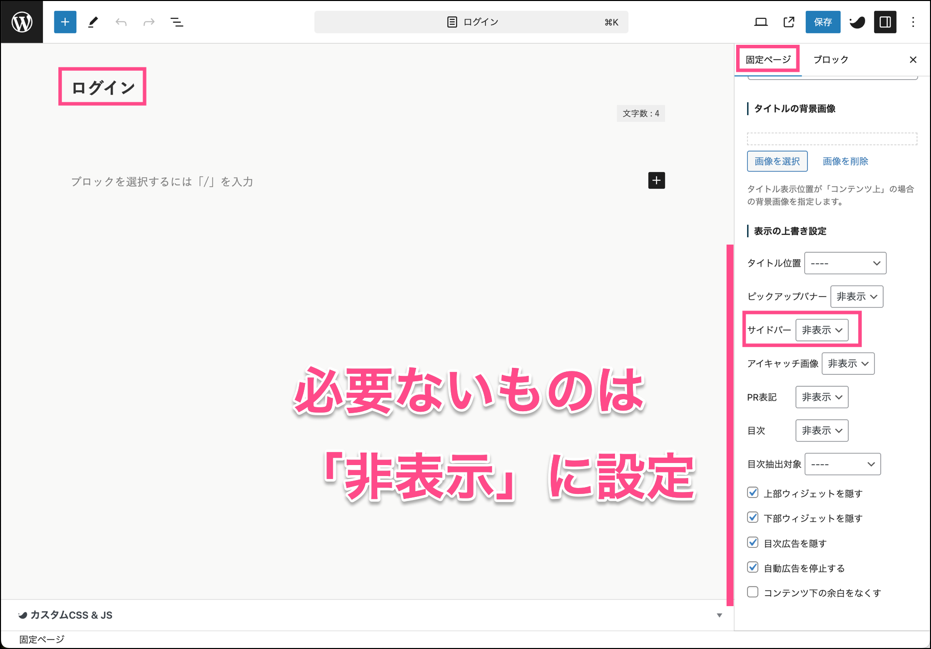 Luxlinerで最低限必要な固定ページとしてログインページがありますので、以下の例ではログインページのサイドメニューを非表示にします。