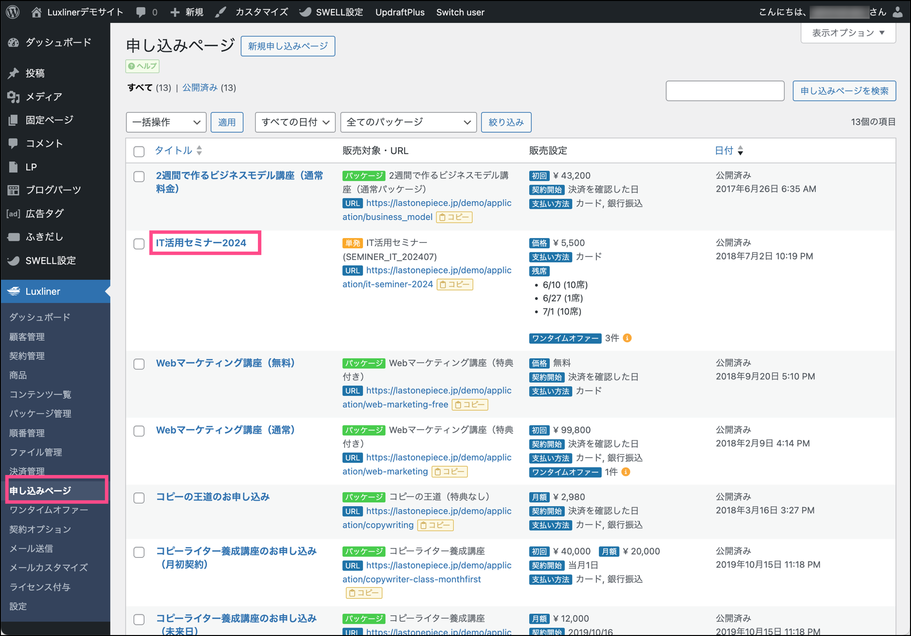 申し込みページの一覧から各タイトルをクリックして編集画面に入ります。