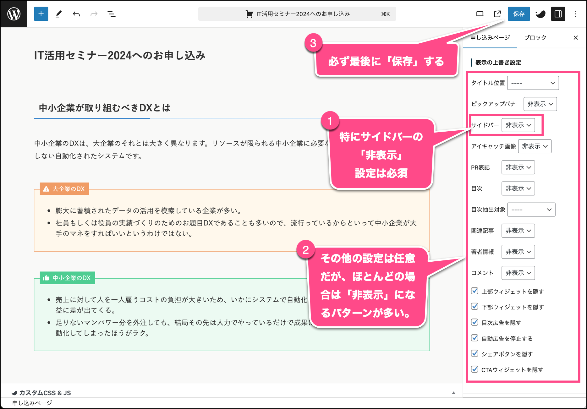 編集画面の右側のメニューから申し込みページタブを選択し、SWELL設定の表示の上書き設定内のサイドバーを「非表示」に変更します。