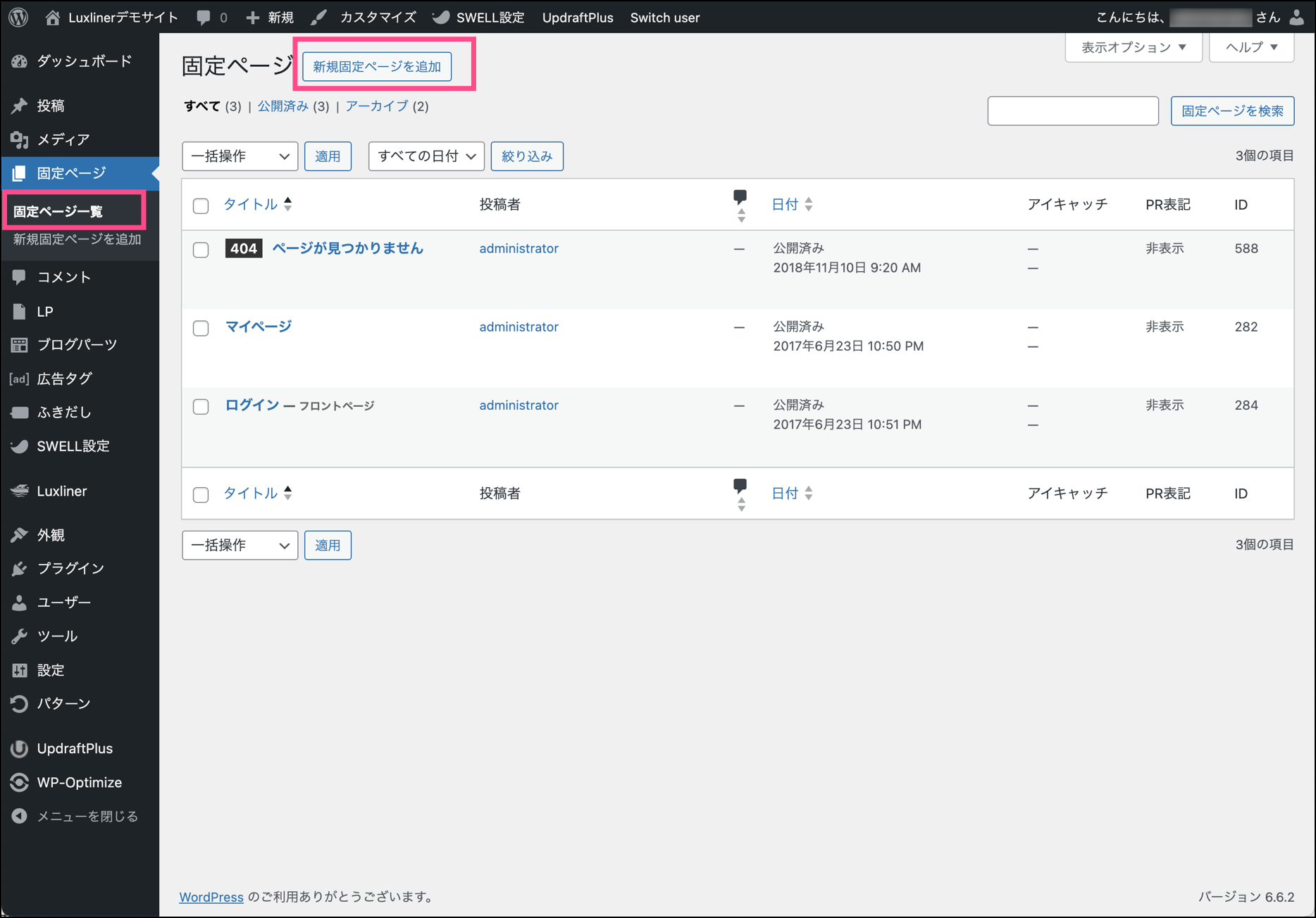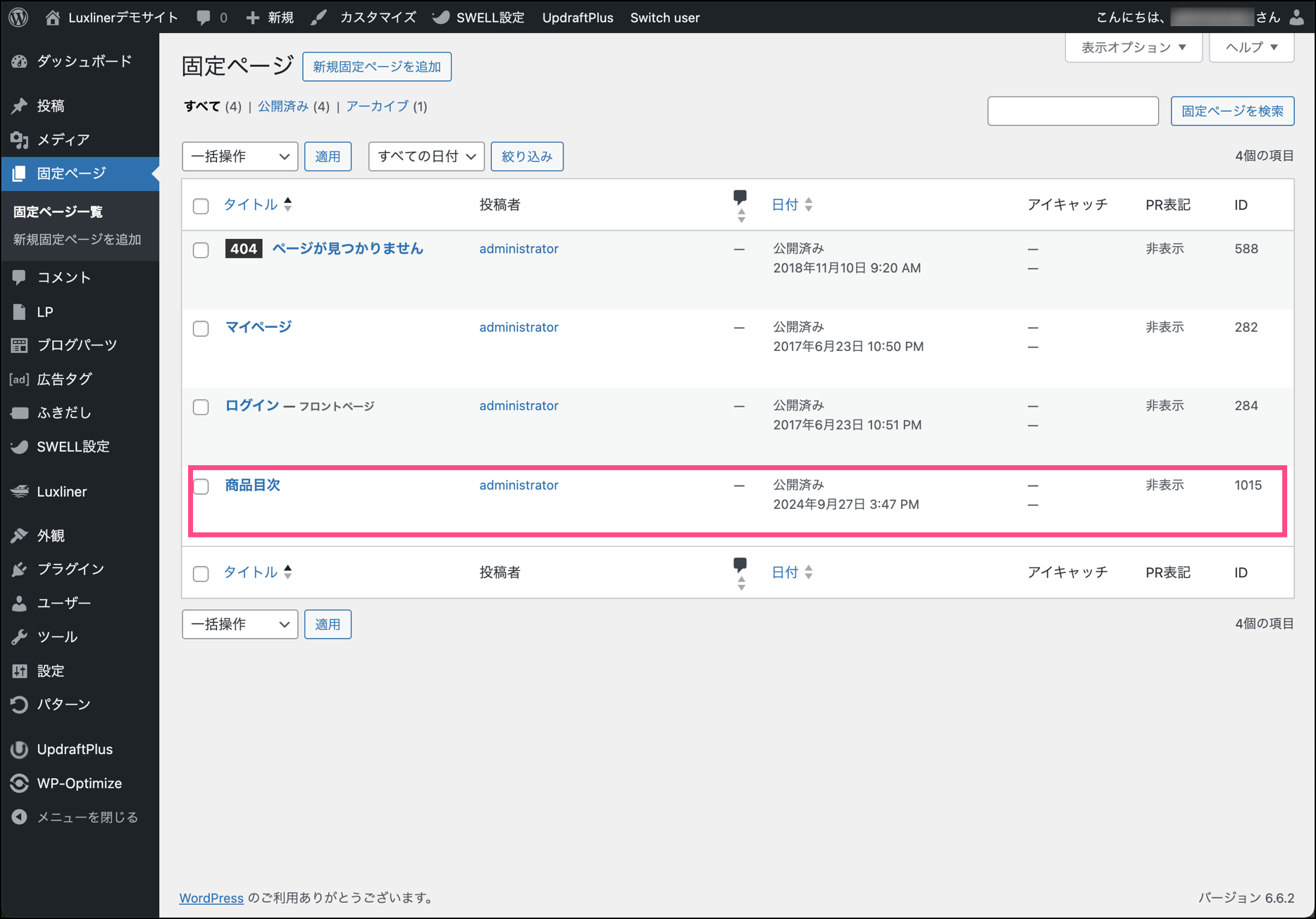 作成した固定ページを公開して、固定ページ一覧画面を表示し、以下のように一覧に追加されていることを確認して下さい。