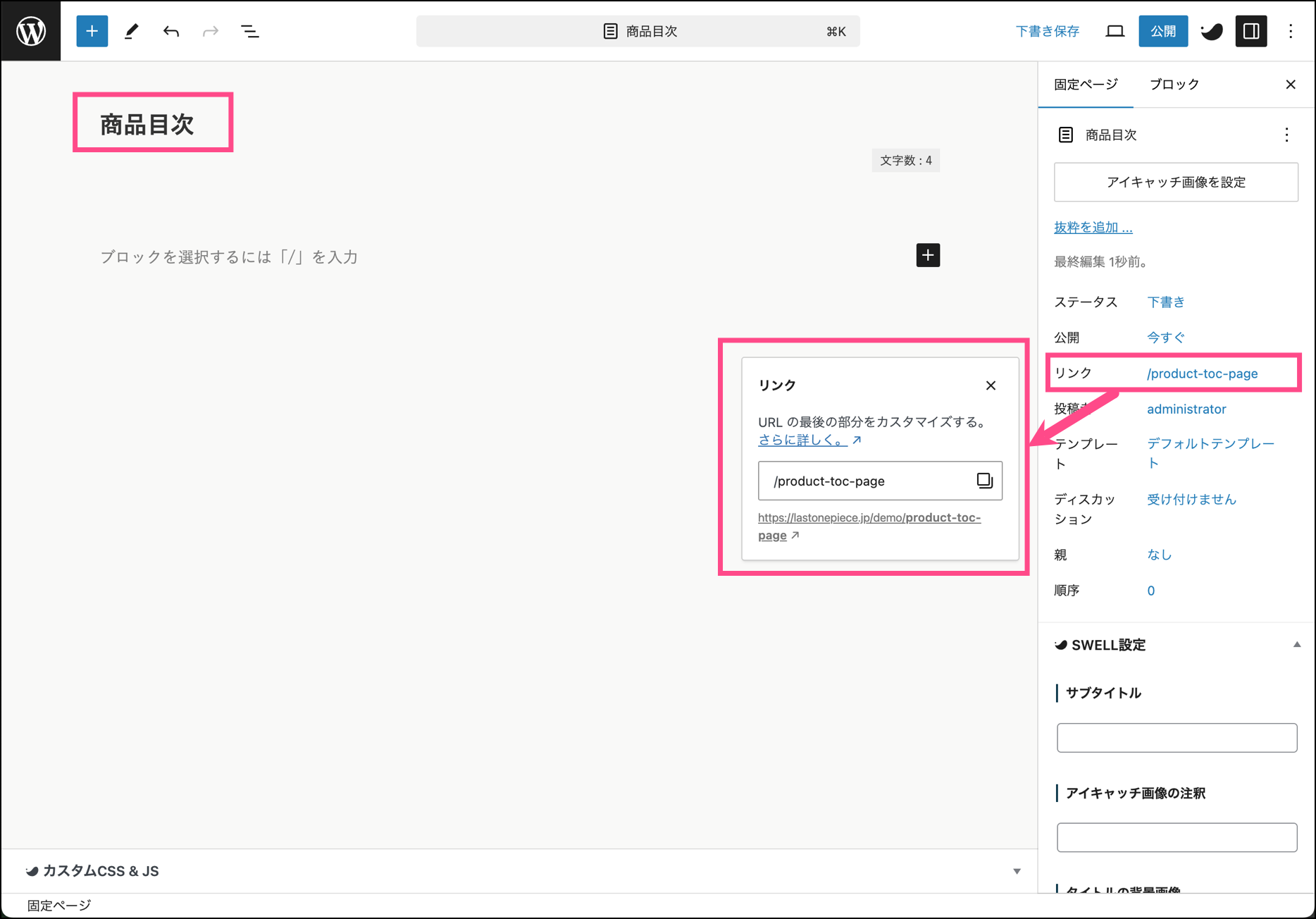 リンクは、英数字で既存のページのリンク名と重複しないものにして下さい。