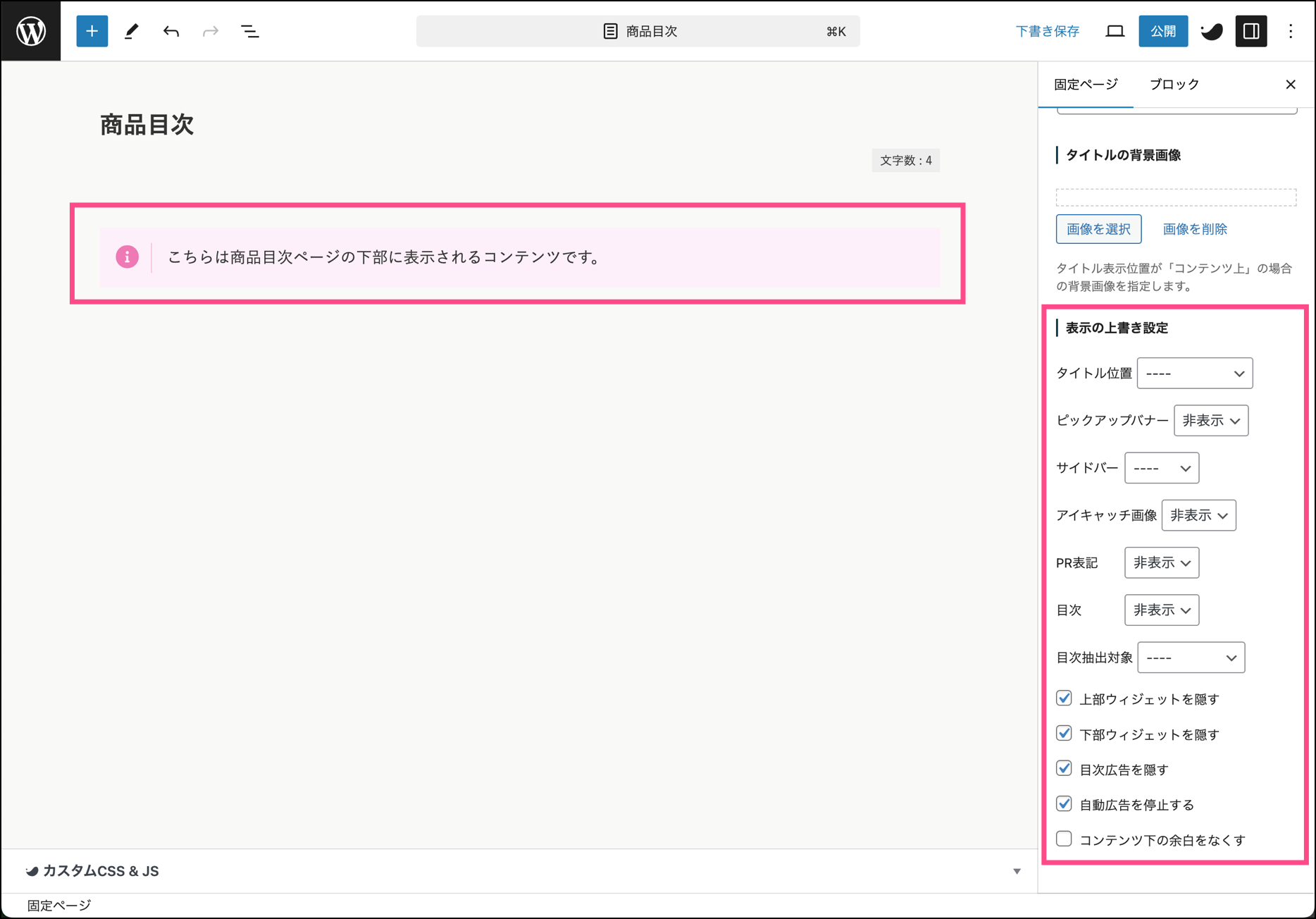 タイトルは何でも構いませんが、わかりやすいように「商品目次」などとしておくと良いでしょう。実際に目次が表示される際は、タイトルには商品名が表示されます。