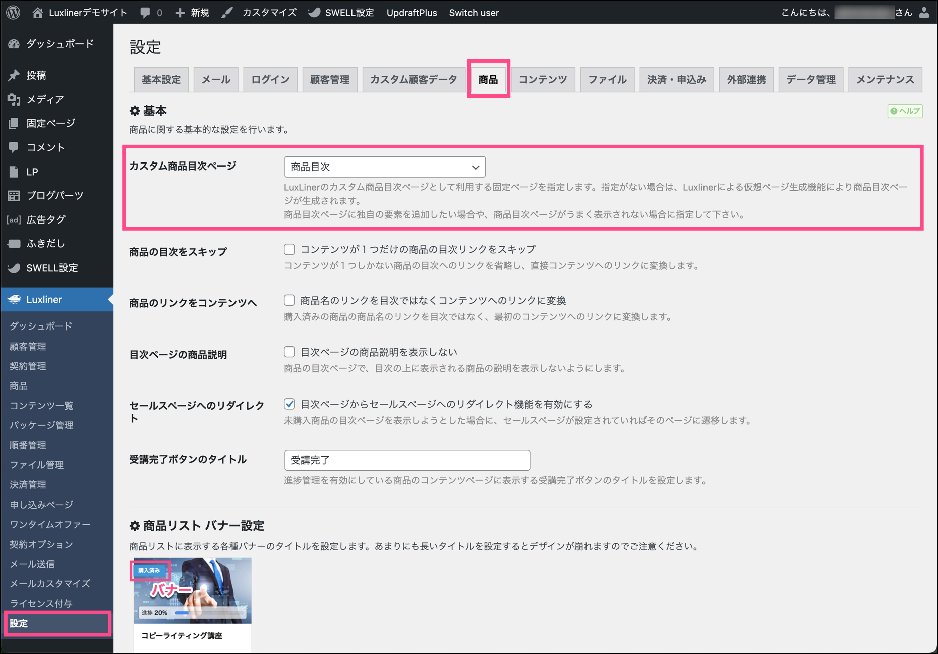 Luxlinerの設定画面の商品タブにて、カスタム商品目次ページのドロップダウンリストから、作成した商品目次ページを選択します。