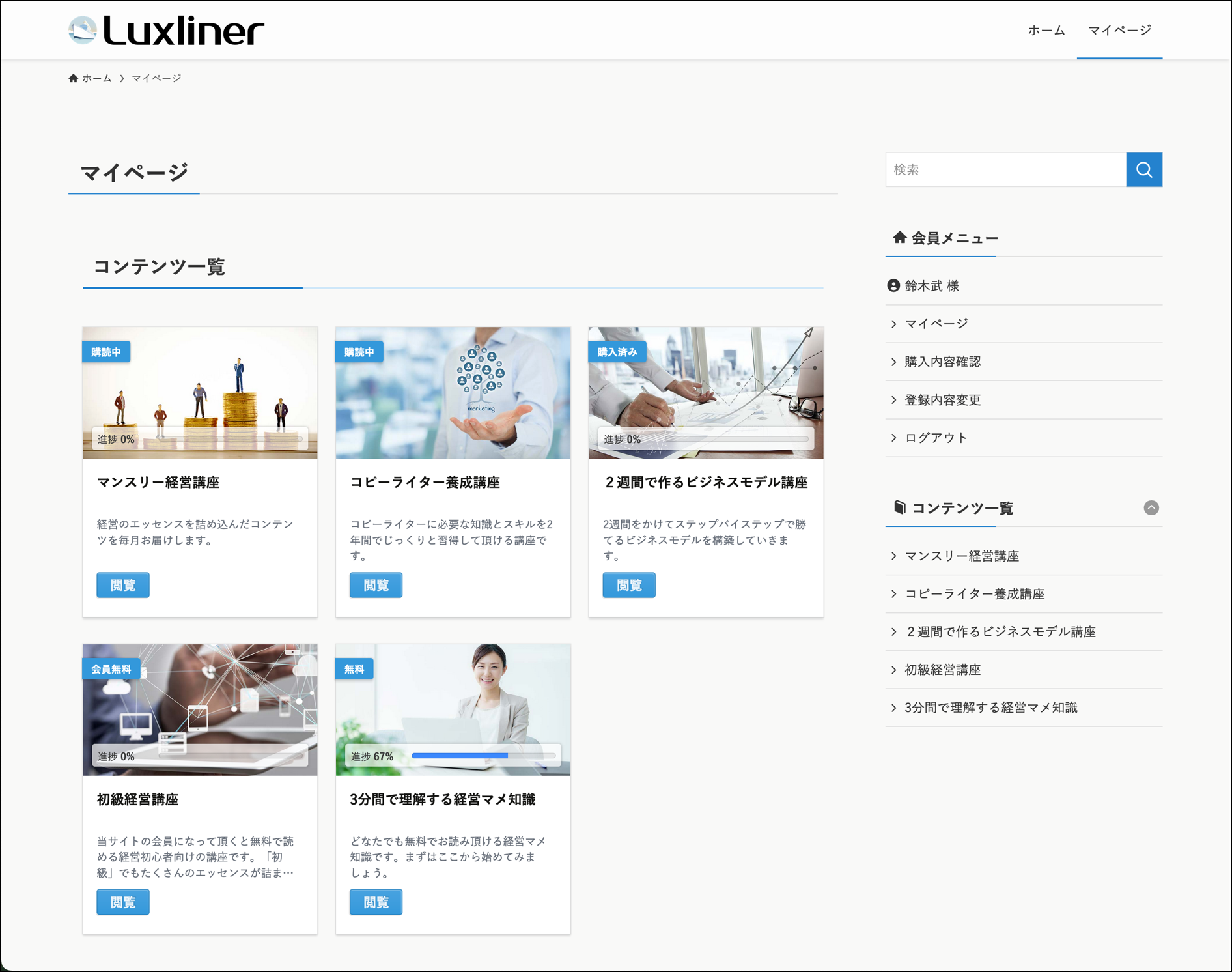 会員がログインすると、マイページを表示し、会員がアクセス可能なコンテンツの一覧を表示することができます。