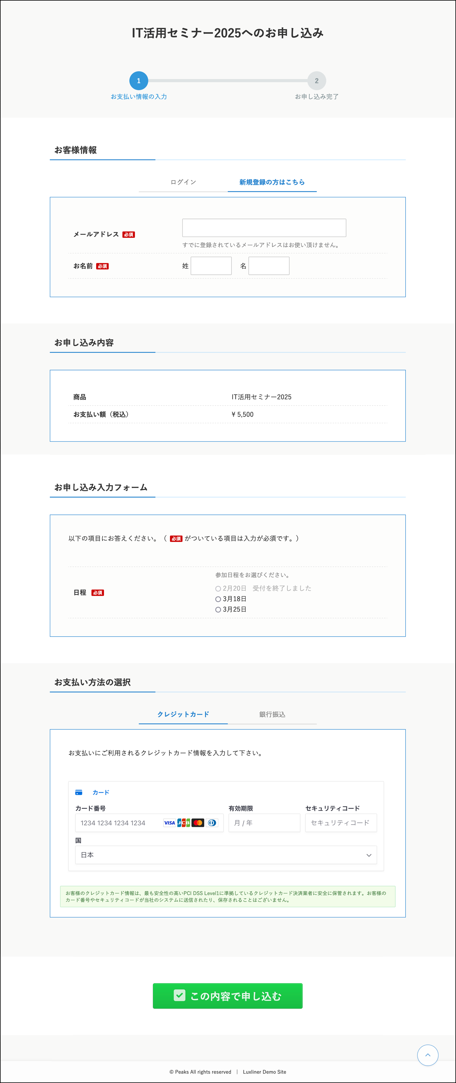 大きな画像となってしまいますが、以下は申し込みページの例です。Luxlinerではコンテンツ商品だけでなく、セミナーやイベントなどへの参加申込みページを作成することも可能です。